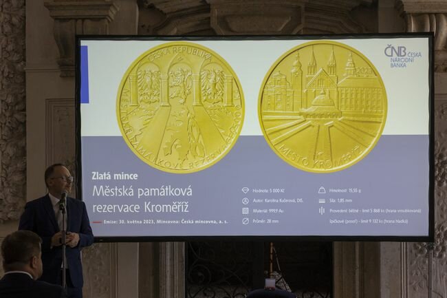 Česká národní banka (ČNB) v úterý 30. května v prostorách Arcibiskupského zámku představila zlatou minci s motivy Městské památkové rezervace Kroměříž. Na nově vydané minci jsou ztvárněny motivy historického jádra města a také komplexu zdejšího zámku a zahrad, který je zapsaný na Seznamu světového kulturního a přírodního dědictví UNESCO. Slavnostní akce se zúčastnil také hejtman Zlínského kraje Radim Holiš.