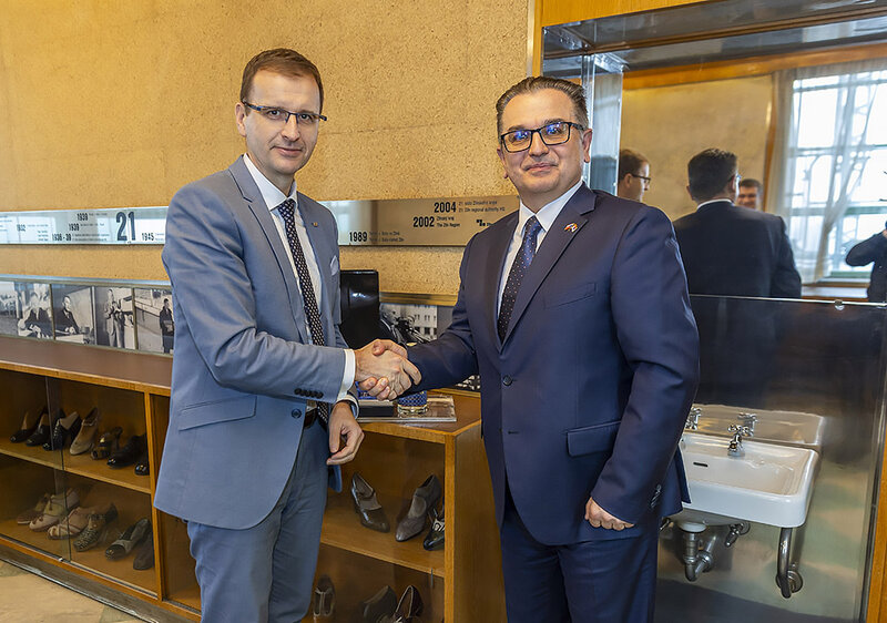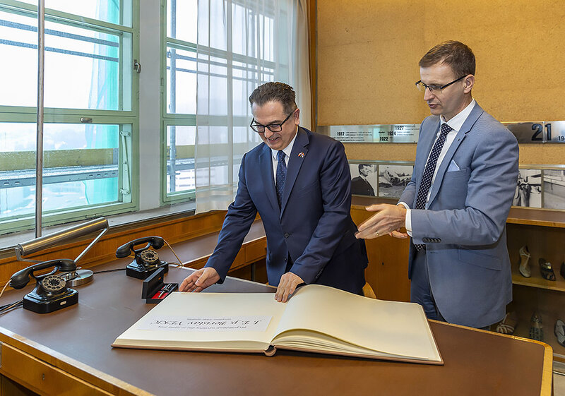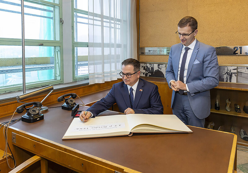 Velvyslanec Berislav Vekić si poté prohlédl legendární pojízdnou Baťovu kancelář ve výtahu a podepsal se do pamětní knihy.