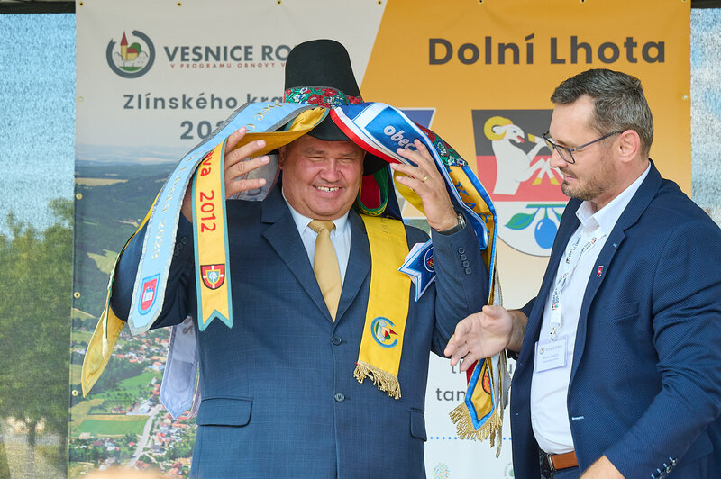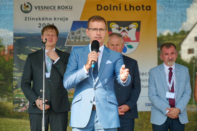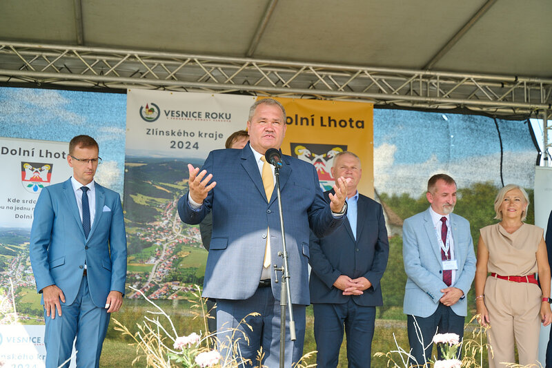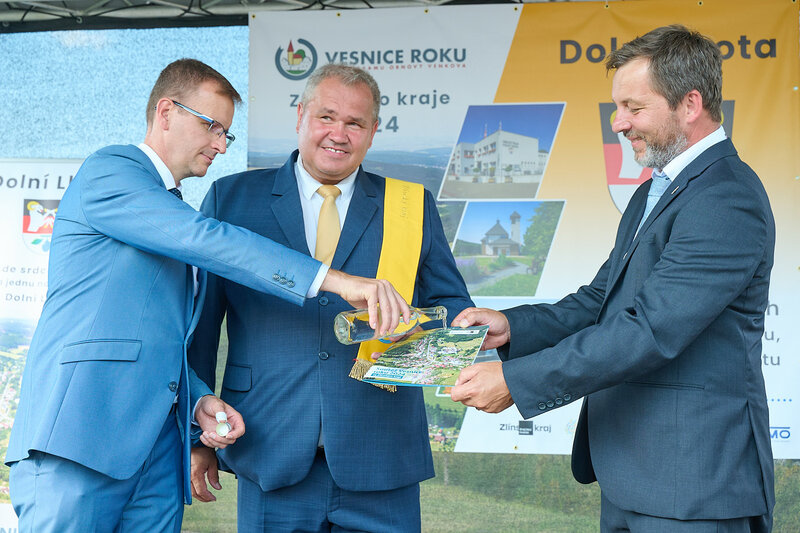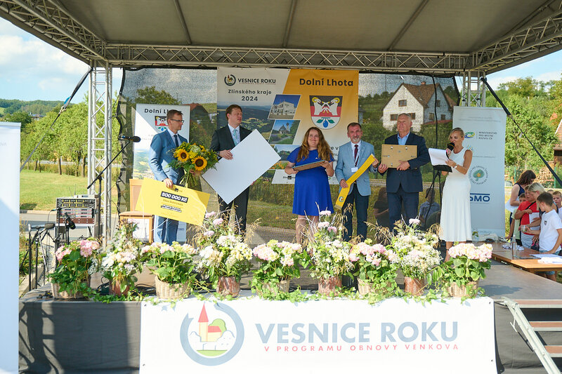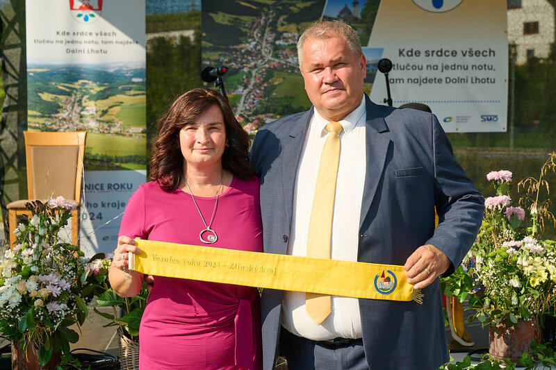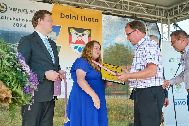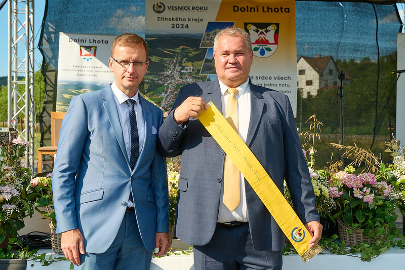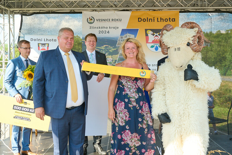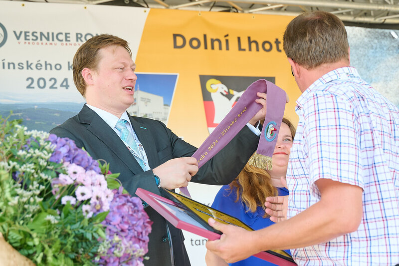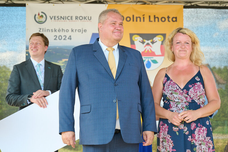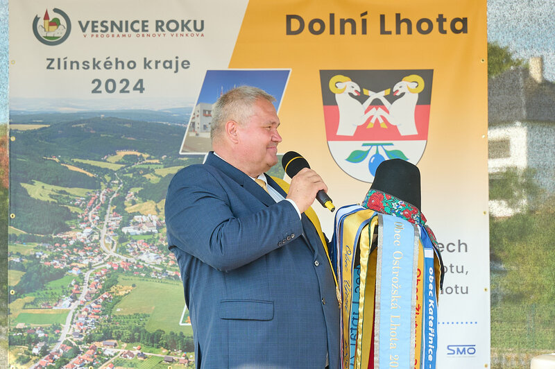 ZLÍNSKÝ KRAJ – Slavnostní předání ocenění Vesnice roku Zlínského kraje 2024 se v sobotu 10. srpna uskutečnilo v Dolní Lhotě, tedy letošní vítězné obci. Zlatou stuhu a putovní klobouk za vítězství v soutěži si převzal starosta Jaroslav Masař z rukou hejtmana Radima Holiše za účasti zástupců vyhlašovatelů soutěže, tedy Ministerstva zemědělství, Ministerstva pro místní rozvoj, Spolku pro obnovu venkova, Svazu měst a obcí ČR a dalších hostů. Převzít ceny si do Dolní Lhoty přijeli také představitelé dalších oceněných obcí.