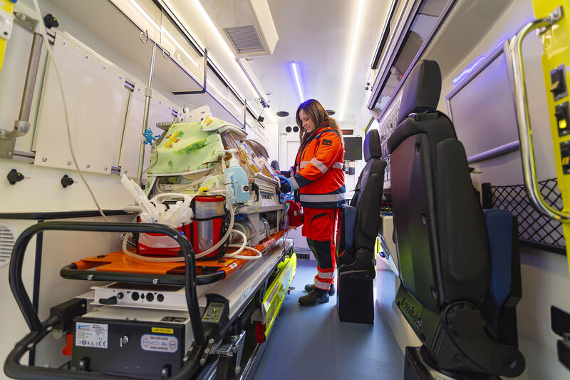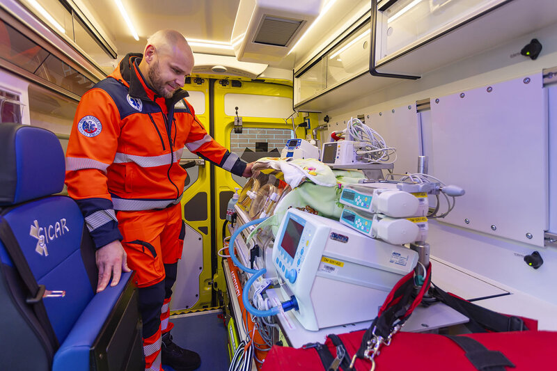 Právě tyto změny v ambulantním prostoru byly navrženy ve spolupráci s pracovníky novorozenecké JIP Krajské nemocnice T. Bati ve Zlíně pod vedením primáře Jozefa Macka. „Další viditelnou změnou je celkem pět míst k sezení včetně řidiče. V případě potřeby je tak nově možné spolu s dítětem transportovat i matku.Sanitní vůz je vybaven tak, že umožňuje provádět kompletní resuscitační i intenzivní péči během cesty,“ doplnil primář novorozeneckého oddělení Krajské nemocnice T. Bati ve Zlíně Jozef Macko. Pacient je vždy v transportním inkubátoru. Ten je majetkem zlínské nemocnice a do sanitky se nakládá bezprostředně před výjezdem.