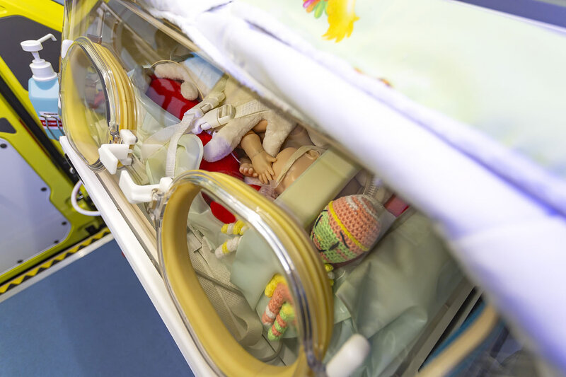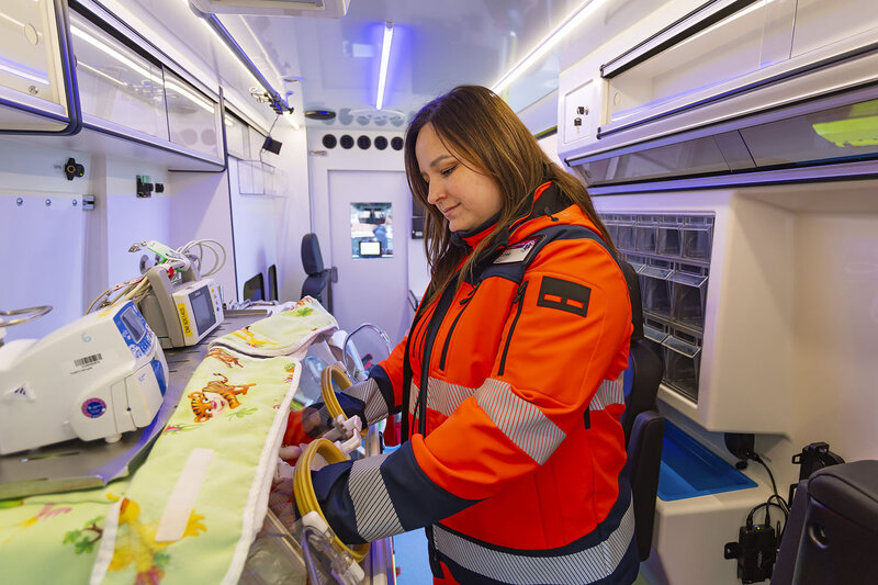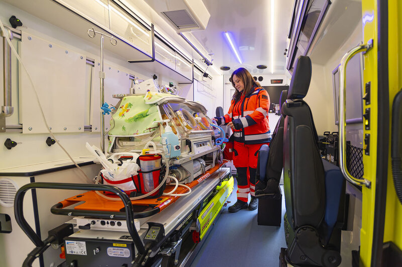 Pro nejmenší pacienty vyjíždí novorozenecký tým do porodnic ve Zlínském kraji, tedy do Kroměříže, Uherského Hradiště, Vsetína a Valašského Meziříčí. Novorozenci ale mohou být převáženi i do specializovaných pracovišť v Brně, Olomouci či v Praze. Pro posádku to znamená výrazně delší čas, který v sanitce může strávit, a tak je ambulantní prostor nad rámec obvyklého vybaven i vlastním autorádiem a monitorem s celou řadou funkcí.