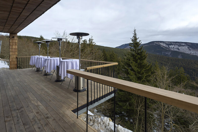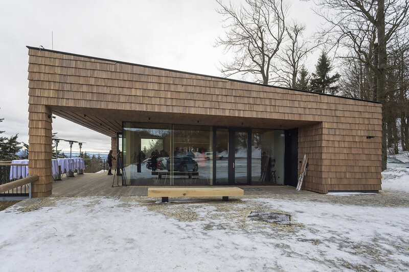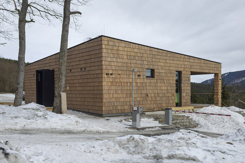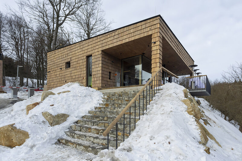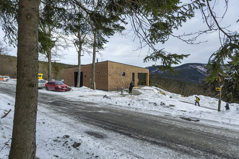 Nízká a na první pohled nenápadná dřevostavba nabízí velkorysý prostor doplněný ochozem, který bude přístupný turistům a nabídne nové výhledy do krajiny. Celý objekt má zatravněnou střechu a na jeho stavbu byl použit stavební materiál, který odpovídá nejen regionu, ale i náročným podmínkám Pusteven – tedy dřevo, sklo a kámen. Stavba je ze dvou stran prosklená a nabízí skutečnou průchozí bránu, která je vyústěním jediné příjezdové cesty z Prostřední Bečvy na Pustevny. Celé prostranství je vydlážděno kameny a vznikla i točna pro autobusy, stávající parkoviště zůstalo zachováno.