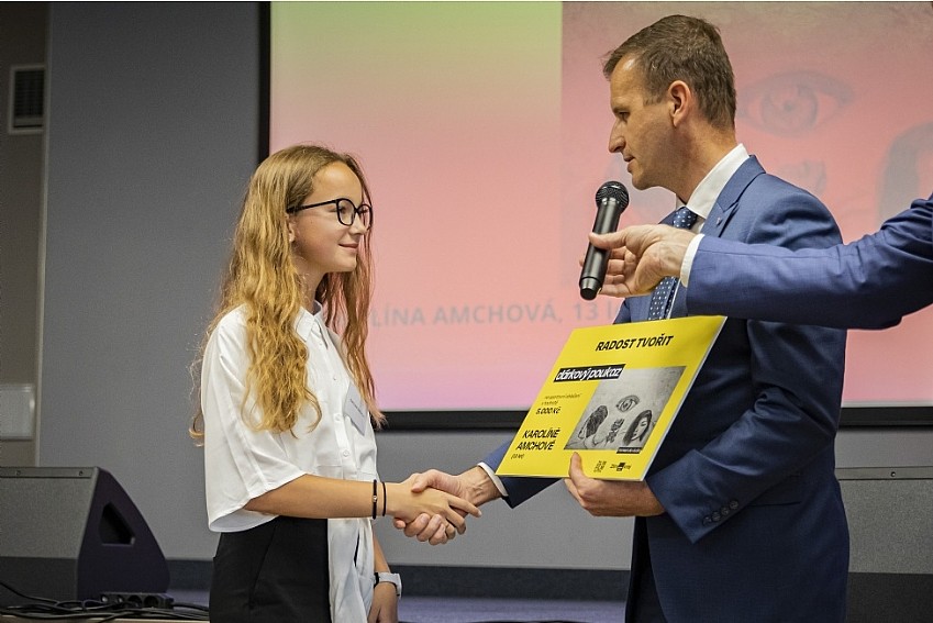 ZLÍNSKÝ KRAJ – Slavnostní vyhlášení vítězů mezinárodní výtvarné soutěže dětí a mládeže se zrakovým postižením s názvem RADOST TVOŘIT se včera v rámci filmového festivalu uskutečnilo ve Zlíně. Téma letošního ročníku soutěže znělo „Sdílejme si, co je v nás“. Jedno z ocenění, Cenu Zlínského kraje, osobně předal hejtman Radim Holiš třináctileté Karolíně Amchové z 5. Základní školy Cheb za její práci nazvanou Pohled do duše. Tu vytvořila s pomocí televizní kamerové lupy.
