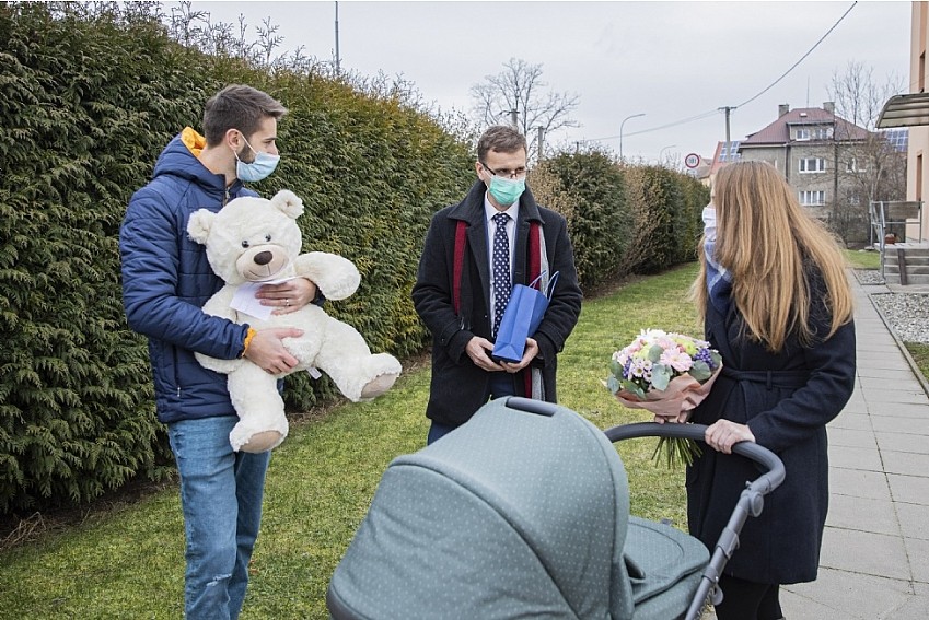 ZDOUNKY – Mladou rodinu Šumberových ze Zdounek na Kroměřížsku dnes navštívil hejtman Radim Holiš, aby manželům pogratuloval k narození jejich dcery Ely, která na svět přišla jako první občánek roku 2021 ve Zlínském kraji. „Chtěl bych vám jménem celé Rady Zlínského kraje srdečně poblahopřát k narození děťátka. Malé Ele přeji za nás všechny hodně zdraví a úsměvů obou rodičů. Až pominou všechna opatření, rádi vás společně s kolegy radními přivítáme ve Zlíně, provedeme vás po Baťově mrakodrapu a podíváme se, jak vám miminko roste,“ řekl rodičům Kristýně a Michalovi Šumberovým hejtman Radim Holiš. Tatínka požádal, aby byl své manželce oporou a co nejvíc jí pomáhal. Mamince předal kytičku a finanční dar pro potřeby miminka ve výši 10 tisíc korun. Malá Elinka dostala plyšového medvěda. Tradiční návštěva prvního krajského občánka se letos nemohla uskutečnit v porodnici, jak bývá zvykem, ale proběhla za dodržení hygienických nařízení před vstupem do domu, kde rodina bydlí. 12. 12. 2020 Další informace: Helena Mráčková oddělení komunikace a vztahů s veřejností 577 043 191, 731 555 179 helena.mrackova@kr-zlinsky.cz