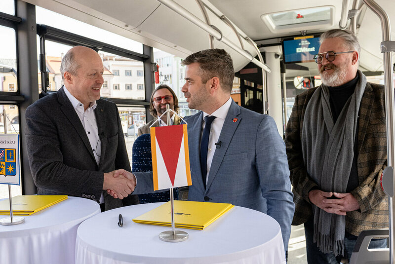 Při příležitosti podpisu deklarace dnes představilo vedení města Kroměříž také dva nové hybridní autobusy značky MAN, které doplní flotilu kroměřížské MHD. Oba vozy kombinují pohon na naftu a elektřinu, dohromady přišly na zhruba 11,7 milionu korun.