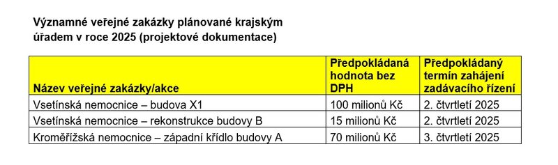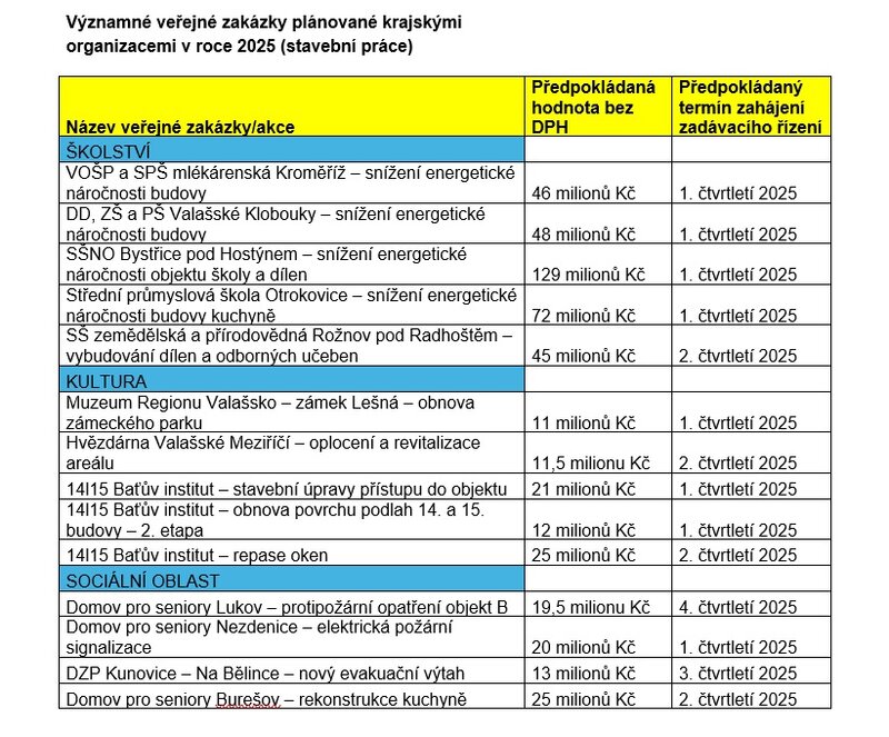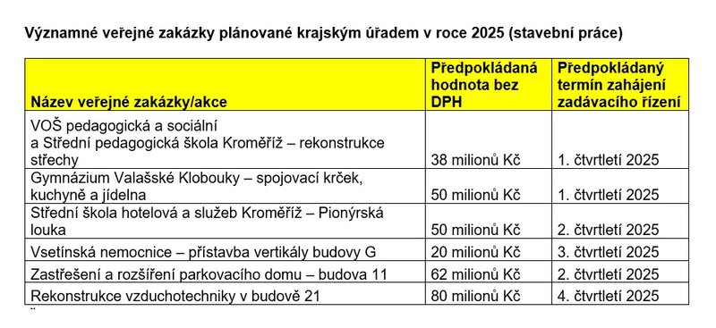 „Mezi ty největší, které letos chceme zahájit, patří například zateplení objektů našich středních škol v Kroměříži, Otrokovicích nebo Valašských Kloboukách, výstavba odborných nových dílen v Bystřici pod Hostýnem, dále zastřešení a rozšíření parkovacího domu vedle krajského úřadu, obnovu zámeckého parku v Lešné u Valašského Meziříčí nebo rekonstrukce kuchyně v Domově pro seniory Burešov. Začít chceme také s projektovou přípravou nového centrálního objektu Vsetínské nemocnice. U všech projektů, které chystáme, klademe maximální důraz na to, aby byly po všech stránkách dobře připravené, včetně kvalitní projektové dokumentace,“ přiblížil radní Miroslav Zemánek.