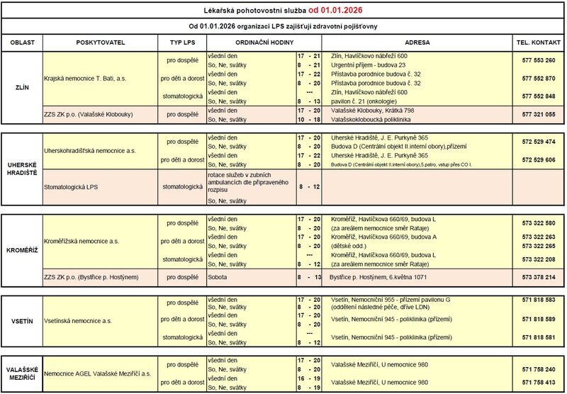 Od 1. ledna 2026 dochází ve Zlínském kraji k úpravě provozu některých lékařských pohotovostních služeb (LPS) pro dospělé pacienty. Konkrétně bude ukončen provoz LPS v Rožnově pod Radhoštěm a v Uherském Brodě. Ke změně provozní doby dochází také v Bystřici pod Hostýnem, kde bude pohotovost otevřena pouze v sobotu od 8 do 13 hodin. Tyto úpravy souvisejí s legislativní změnou organizace lékařských pohotovostí, kdy od 1. ledna přechází povinnost zajištění lékařských pohotovostních služeb z krajů na zdravotní pojišťovny.