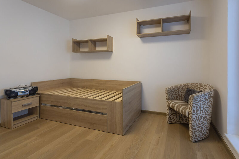Chráněné bydlení je rozděleno na dvě domácnosti. Do první se vstupuje hlavním vchodem z ulice. V přízemí se nachází kuchyň a obývací pokoj, v prvním patře pak pokoje pro klienty. K dispozici jsou tři, jeden dvoulůžkový a dva jednolůžkové. Každý z nich má vlastní sociální zařízení. V patře se také nachází technická místnost. Do druhé domácnosti se vstupuje vchodem ze dvora, celá domácnost je v přízemí. Nabízí celkem čtyři jednolůžkové pokoje s vlastním sociálním zařízením. Součástí je společná kuchyň s jídelnou a technická místnost.