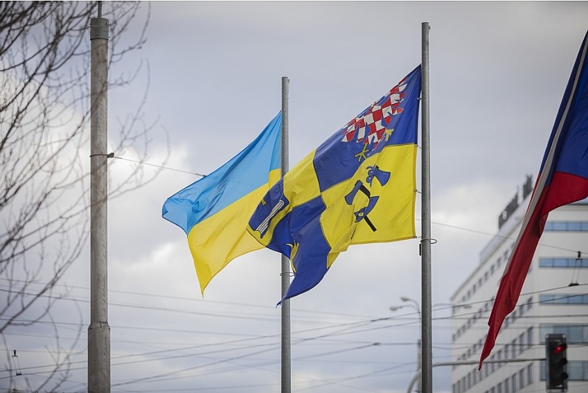 Před sídlem hejtmanství byla jako výraz solidarity vyvěšena ukrajinská vlajka